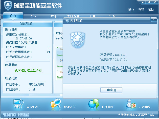 瑞星2009版已经开始升级了!已去掉体验版字样