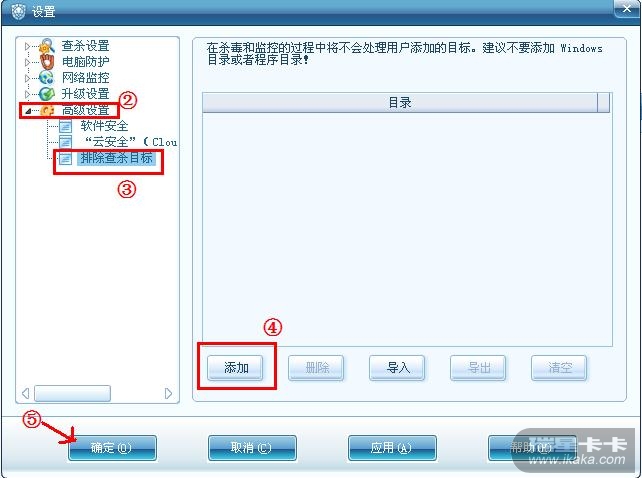 2.点击“高级设置”后点击“排除查杀目标” 如图2