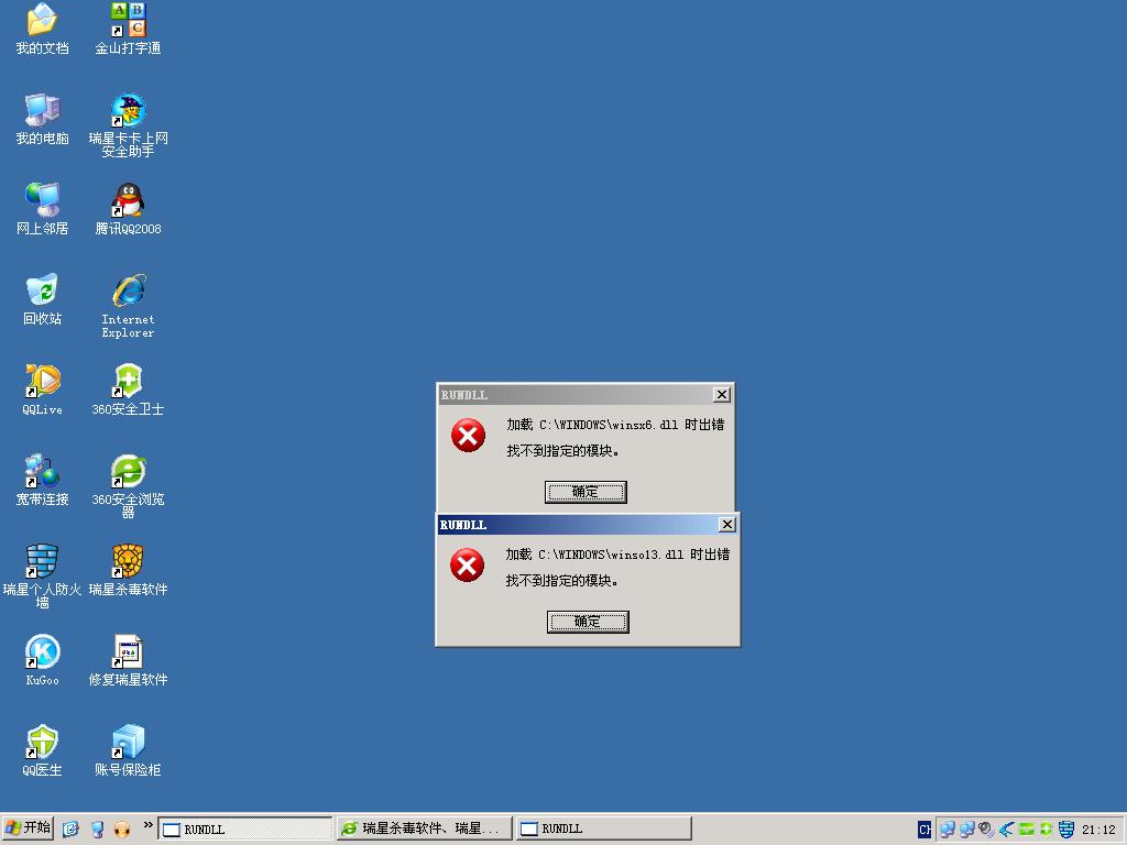 今天瑞星从20.的版本升级到21.的版本后,开机就不停的提示 “加载c:\windows\winso13.dll时出错,找不到指定模块。”