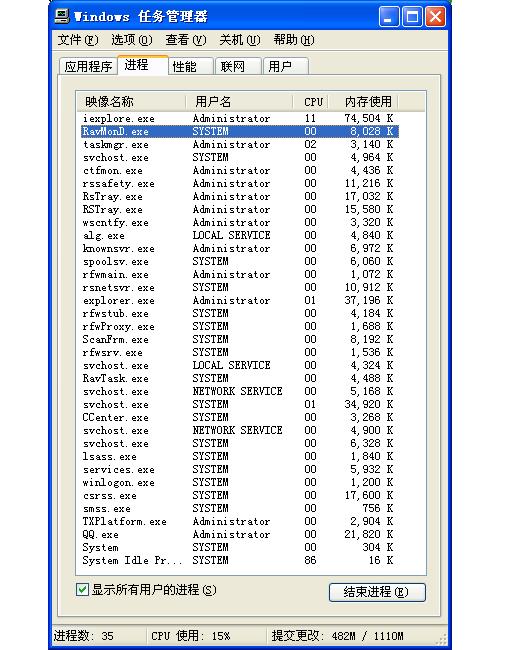 现在任务管理器显示的状态下,除了瑞星外是否运行了其他程序?