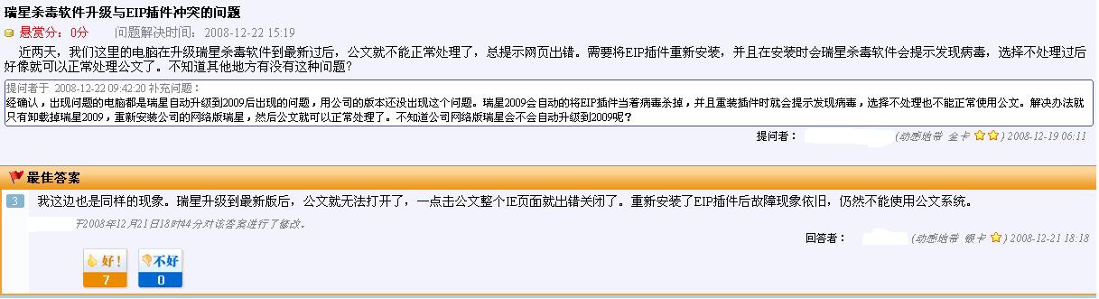 工程师12回复:病毒库版本:21.09.11,不报毒!在升级到最新版后,安装插件时到是不报病毒了,可是OA的公文仍然不能进行处理,IE页面左下角报错。禁用所有的主动防御与实时监控都不行,只有在卸载2009后即恢复正常,安装2008版任意版本也正常。