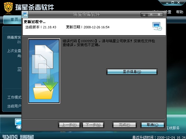 刚刚还是这个问题。就是说瑞星的安装包错误,我已经使用
