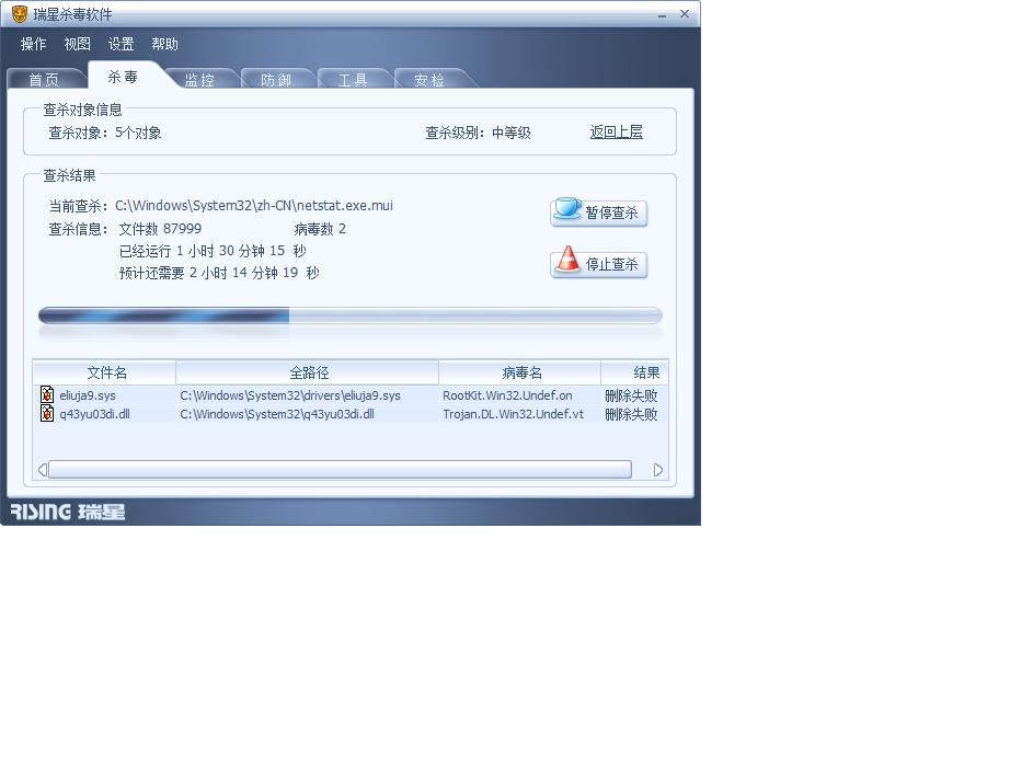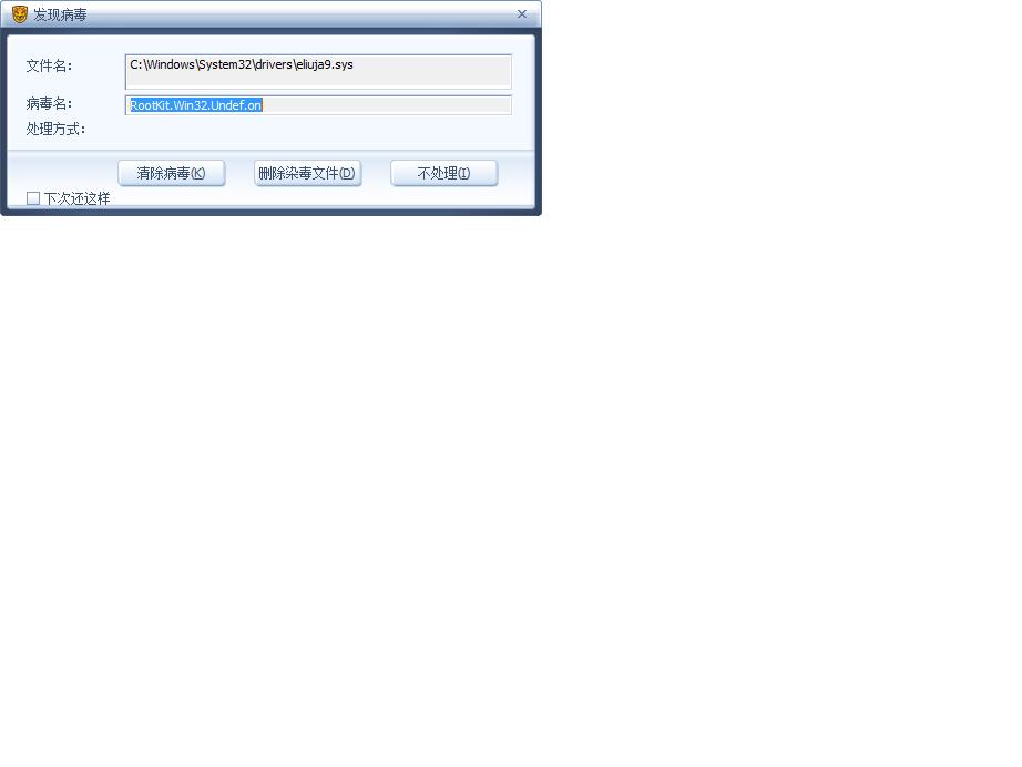 这两个病毒分别是C:\Windows\System32\drivers\eliuja9.sys,中的是RootKit.Win32.Undef.on;C:\Windows\System32\q43yu03di.dll,中的是Trojan.DL.Win32.Undef.vt。