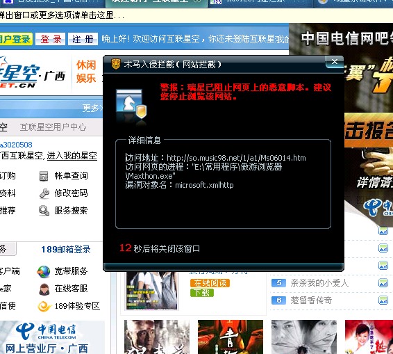 一打开广西互联星空网站,瑞星就报警了