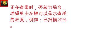 1.改进后台查杀的显示模式:正在查毒时,转为后台,希望单击左键可以显示查杀的进度,例如:已扫描20%。