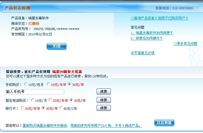 我用手机购买了瑞星,激活的时候出现