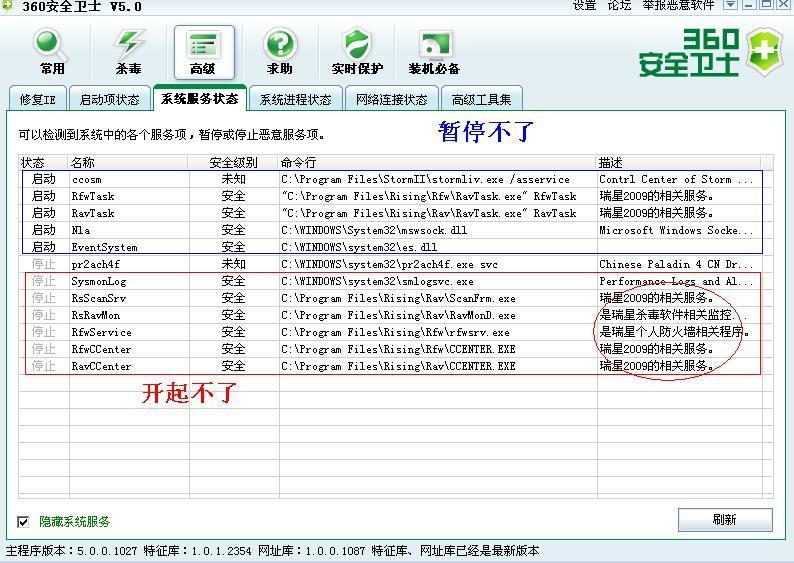 不知什么时候起,这几个系统服务在360里开不了。其中包括瑞星的相关服务。怎么办啊