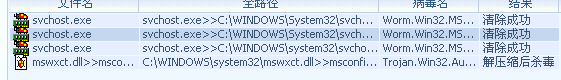 网络连接失败,请正确设置网络配置后重试”杀毒后,发现有个叫Worm.Win32.MS08-067.a的病毒,感染的文件是c:\winows\system32\svchost.exe,查出来两个,都显示清除成功,但是重启电脑一样病毒又出现了,问题依旧,杀毒后能升级