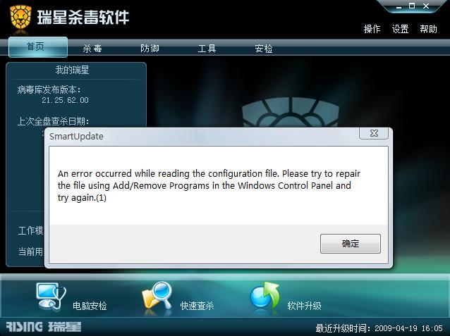 修复杀毒软件:点开始/程序/瑞星杀毒软件/修复,直到完成。