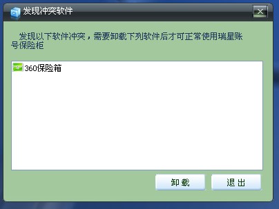 我安装了360保险箱,当然也安装着瑞星账号保险柜,当点击瑞星账号保险柜的时候会提示如图: