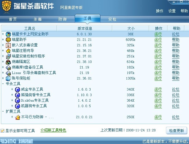 我昨天无意点了瑞星中工具一栏的检查更新,结果装了几个专杀工具和扩展工具,熊猫烧香专杀工具、威金专杀工具、机器狗专杀工具、Diskgen专杀工具和木马行为防御……