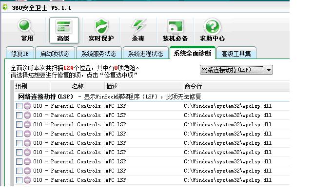 我的电脑用360安全卫士进行系统全面诊断,发现有“网络连接劫持(LSP)—显示winsock绑架程序(LSP),此项无法修复”和“网络协议过滤-显示额外协议和协议绑架此项,此项无法修复”,不知这些是否是病毒,怎么处理?我重新装了系统后在装其他软件前先装瑞星杀毒软件,还是出现这些内容: