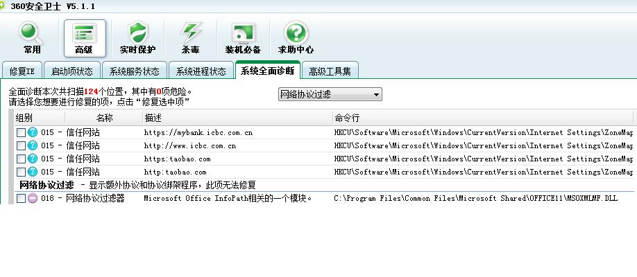 另外360的这个“系统全面诊断”其实就是以前的hijackthis工具的照搬,因为扫描的很详细,所以这里指的项目就算没有标注安全也不见得有问题,从018的值来看,应该是office组件的相关项目,无需修复无问题。