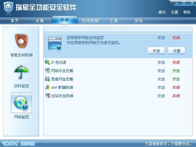 请问一下,2009全功能软件中网络监控中【应用程序网络访问监控对应用程序的网络行为进行监控】的状态是不是默认关闭的?可不可以设为开启?
