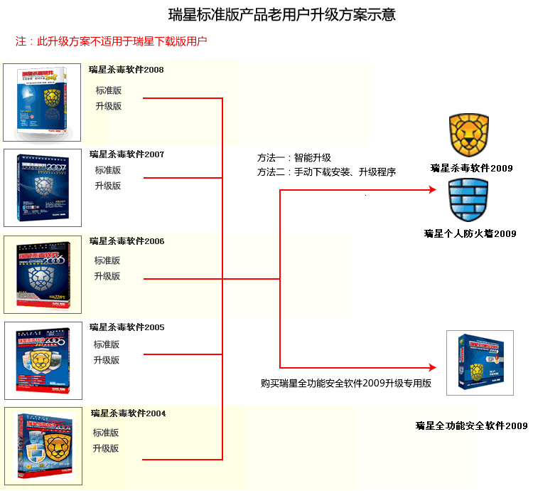 我买的是瑞星2006单机版,这张图上显示瑞星2004可以升级到瑞星2009,那么照此推断我应该能从瑞星2009升级到瑞星2010,是这样吗?升级后杀毒软件和防火墙是分开的,而不是升级成全功能软件吧?