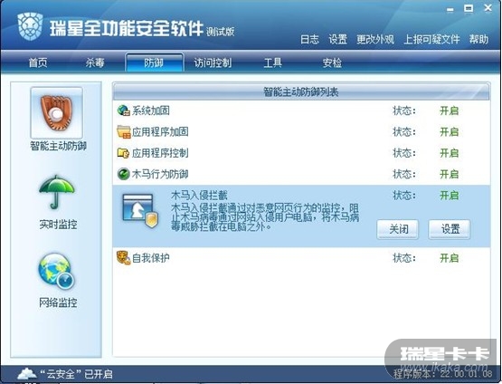瑞星全功能软件2010版的木马入侵拦截功能,与2009版全功能软件有所变化, 2010版【防御】标签项中,木马入侵拦截只对网页上的恶意行为进行拦截。