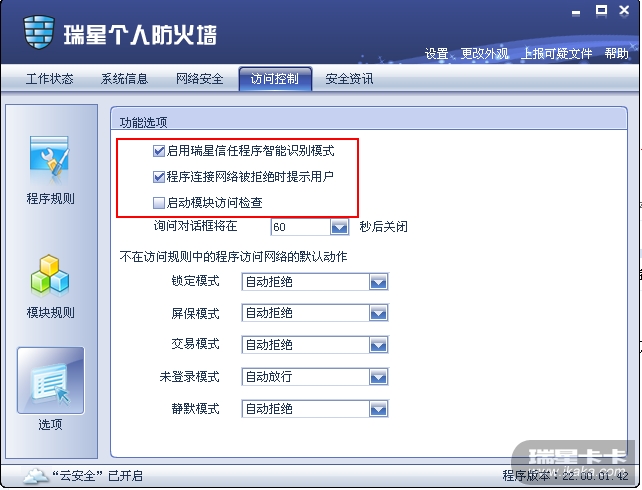 楼主是不是在左边的选项,里面没有选择启用"瑞星信任程序智能识别模式"