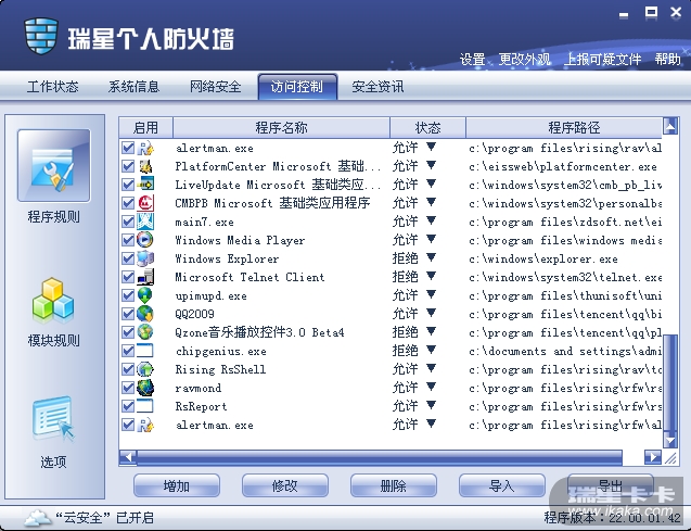 防火墙的访问控制在2009版本时,可以基本上实现自我判断。而2010根本就是一个傻B,不仅不会自我判断并放行程序不说,即使发现了被阻拦的程序,你单击访问规则,跳到防火墙访问控制选项,其中的列表也不会显示出来。需要你不停地用手单击增加,一个一个增加。