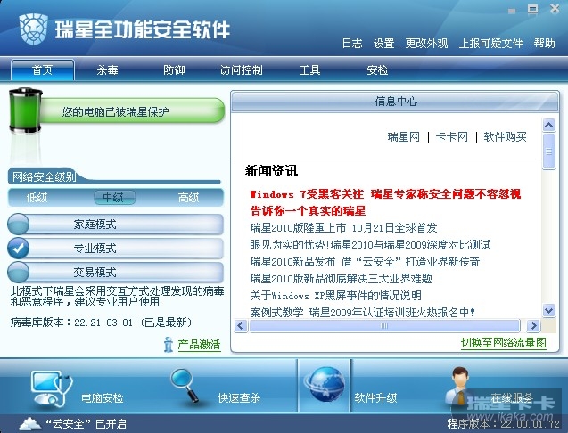 打开瑞星全功能后,再把鼠标位置从杀毒软件移至桌面的空白处,然后再移回鼠标(做这些动作期间未发生点击鼠标的行为,而且瑞星一直前置),突然发现杀毒软件右上角那三个最小化,窗口放大缩小,关闭三个按钮自动变成灰色,“首页”“杀毒”“防御”“访问控制”“工具”“安检”这几个选项卡可以正常点击,但是其他的选项卡点击没有反应,例如“快速查杀”,“软件升级”,“日志”,“设置”,“更改外观”等选项,均无反应 ,我已经重新修复过但还是不行,然后卸载删除配置,重新安装仍出现这种情况 ,不知道有没有人也是这种情况?并恳请工程师尽快解决。