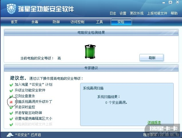 明明我的电脑漏洞数已经为0了,电脑安检显示也为0,可是为什么旁边还是有一个很扎眼的红叉叉呢,虽说没什么,可是看着太不舒服了,希望瑞星能够改进一下,之前好多人发帖说明明已经修复了某个漏洞,可是卡卡安全助手还是提示需要修复,今天早上升级卡卡发现这个问题已经没有了,看来瑞星还是很在意论坛里的人提出的问题的,我提的这个虽说是个小问题,可是还是希望引起瑞星工程师们的注意,因为我觉得一个杀毒软件的成败关键是看细节吧。