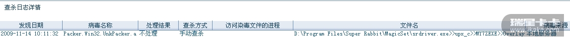 从14日早上发现这个病毒文件srdriver.exe,杀毒软件提示不处理,之后我设置了杀毒软件的病毒隔离区后,也多次升级杀毒软件并进行全盘查杀,在日志中没有看到任何有关病毒的报告,再到昨天卸载了这个存在srdriver.exe的超级兔子,重新下载安装超级兔子后,升级杀毒软件到最新版再进行全盘查杀,查看日志时也没有发现任何病毒,但心中始终有一疑虑:因为这个srdriver.exe文件是在我卸载超级兔子后,才没有的,由于最初杀毒软件发现它是一个病毒未处理,弄得我现在也是满糊涂的,到底这个病毒还在不在电脑上,它是否还会感染我电脑上的其它文件?