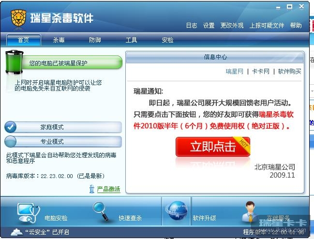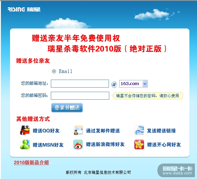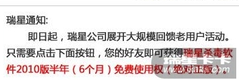 最近,每次启动瑞星杀毒软件,信息面板上会出现“瑞星杀毒软件2010年版半年(6个月)免费使用权(绝对正版)”内容(如下附图)。当进入“立即点击”后会要求输入邮箱号,关键问题在于输入邮箱密码(如下附图2)。