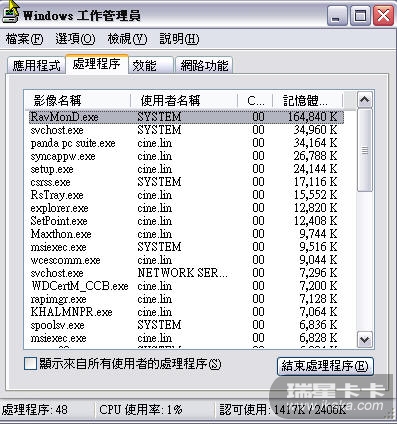 另外,昨天有修复过瑞星了,一开始我以为好了,不过後来就发生上面图的状况,一开始还只有8M~今天一直没空,程序也没有一次打开太多,所以还没发生(今天最高到78M)。