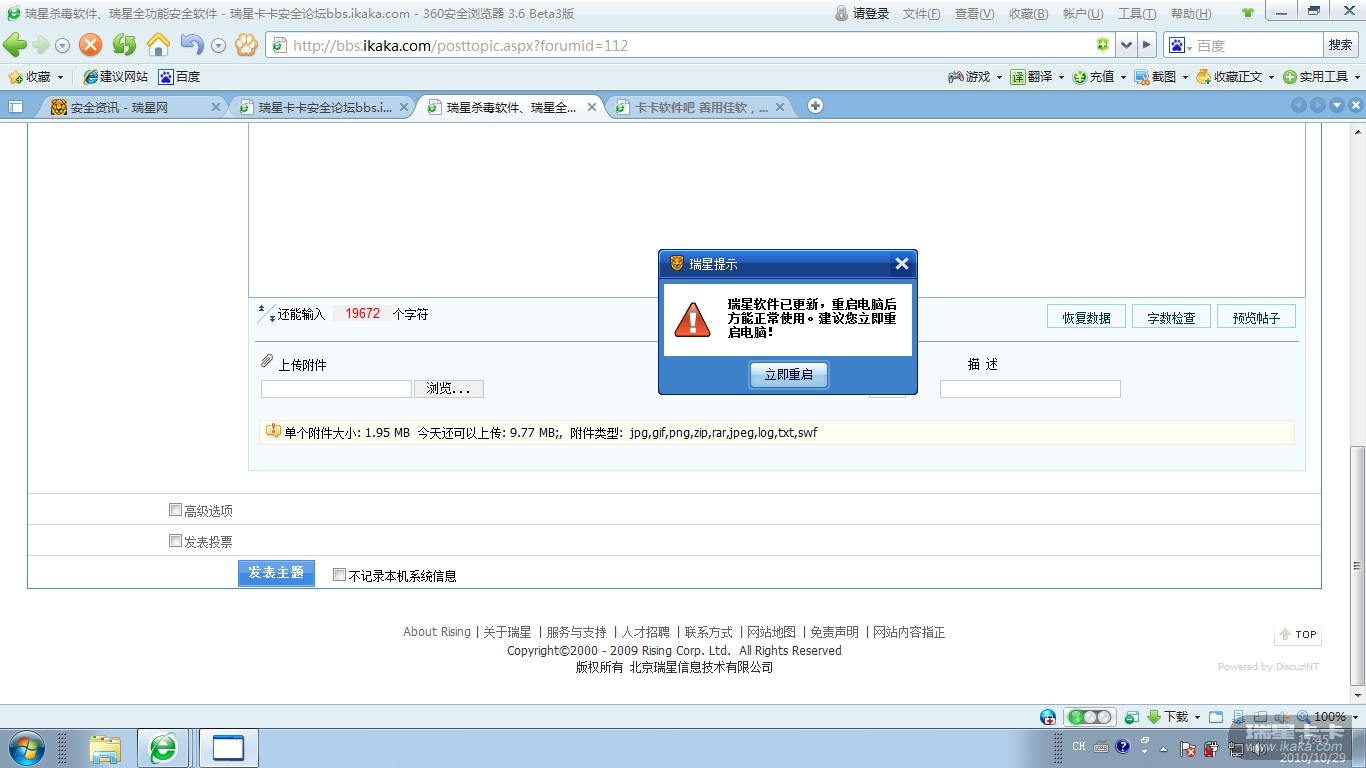 刚才我的瑞星杀毒软件自动升级为2011版,但是升级后不能使用,监控中心也不能开启。点击桌面上的快捷图标后提示:“瑞星软件已更新,重启电脑后方能正常使用。建议您立即重启电脑。”但是,我重启后还是不能用,点击后再次出现上面的提示。