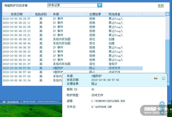 就算没有autorun.inf文件,系统自身的桌面进程也是会执行访问autorun.inf 文件的命令的,2010瑞星的主动防御会常规性的阻止其访问autorun.inf文件的企图,并记录日志,哪怕没那autorun.inf文件,也一样阻止一次并记录日志。 也就是阻止并记录一次桌面程序的访问autorun.inf文件的命令