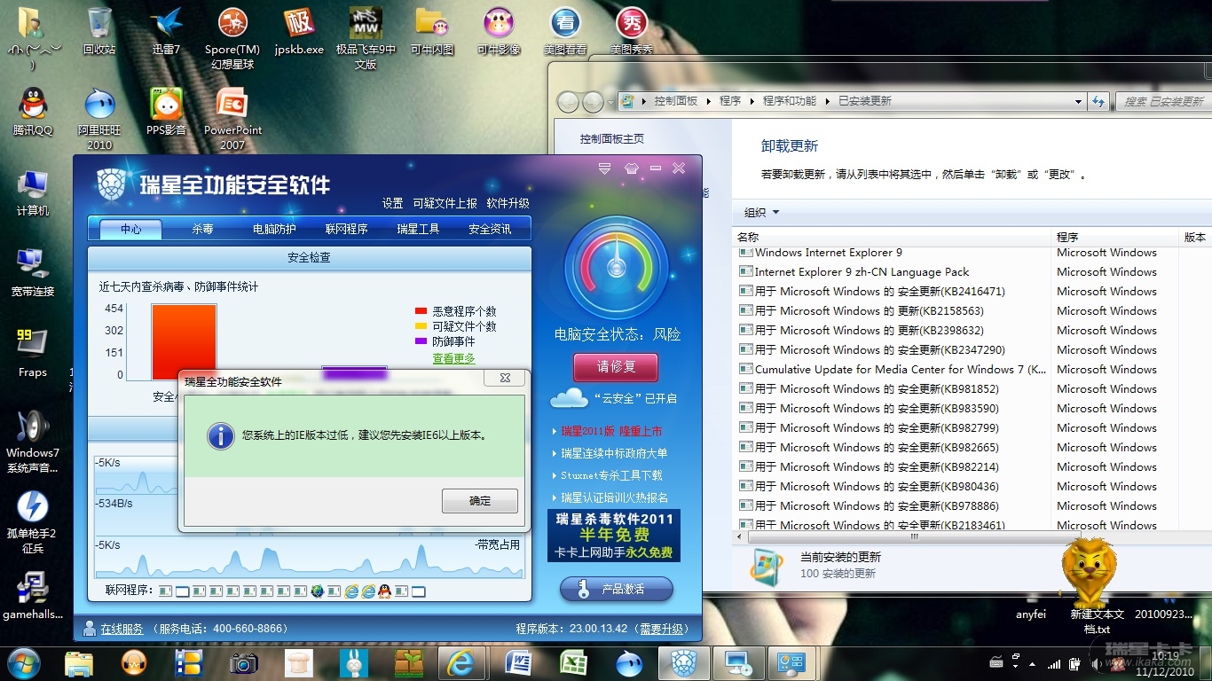 现在瑞星是怎么啦,升级到2011之后,怎么就变得拎不清了,没升到2011之前还是好好的,现在怎么无法升级了呢?说什么我的IE版本过低,有没有搞错,我用的可是IE9测试版,我真的是郁闷了,还提示我说用IE6以上产品,我就不信了,现在难道还会有比IE9还高版本的IE浏览器吗?