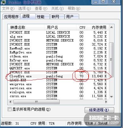 原来是一个名为:cloudsys.exe的进程大量占用cpu,高的时候居然达到了80%。一查才知道,原来这个事瑞星云安全相关的进程。