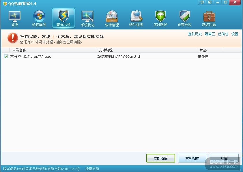 QQ管家报瑞星木马的问题,请将瑞星和QQ管家升级后判断,如有问题,请提供两款软件版本号跟帖反馈。