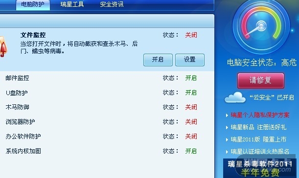 瑞星卡卡安全论坛个人产品讨论区瑞星杀毒软件瑞星杀毒软件2011 病毒库组件RSVIRLIB安装失败,好几个监控打不开