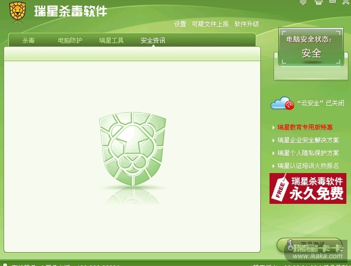 从安装那天开始到现在一直是空白的,刚才看瑞星弹一个什么中奖消息,让点击安全资讯参与,我的安全资讯一直是空白的。只有中间一个小狮子脸的盾。