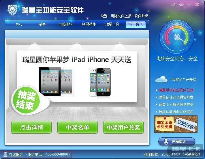 说明:在线服务不应该显示在这里,而是应该显示在瑞星工具当中