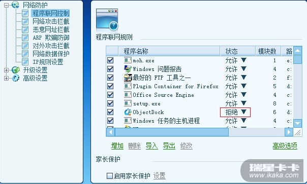 然后打开瑞星个人防火墙主界面——设置——详细设置——规则设置——黑名单;