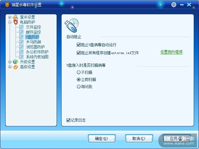 瑞星杀毒软件2011在电脑防护中具有U盘防护功能,能有效阻止U盘病毒自动运行,阻止程序创建autorun.inf文件,在插入U盘时便立即扫描,阻止病毒通过U盘进入电脑