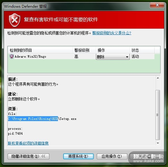 我用的WIN 7系统,最近几天windows defender老弹出一个框说有毒,开始没理它,今天仔细一看居然是说瑞星的安装包有问题!!!