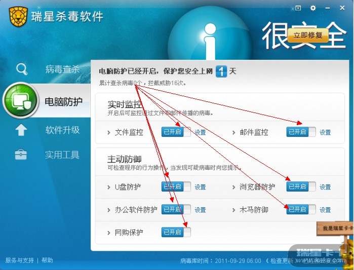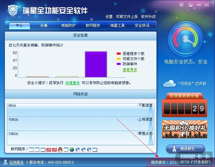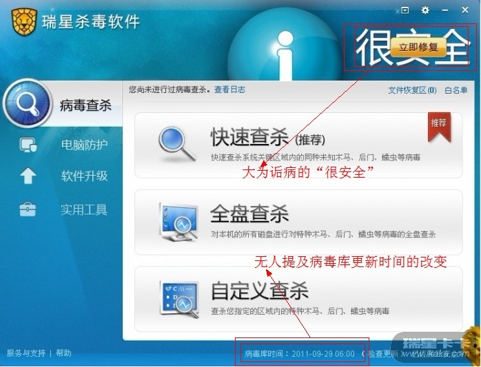 可能是“很安全”字体太大了,所有人都没有发现瑞星改变主界面病毒库提示不再是以往版本的版本号而以更新时间代替