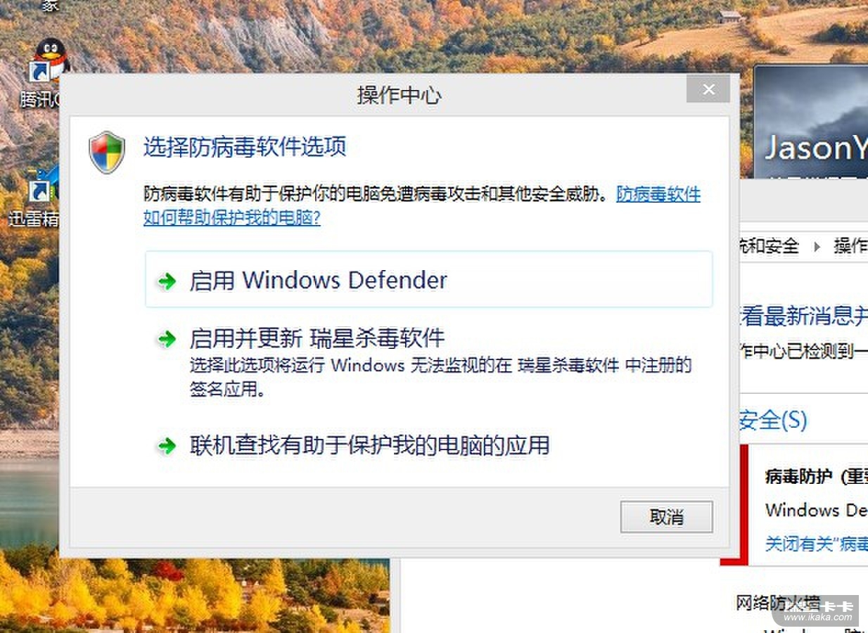 您好。我的电脑是win8.1系统,安装了瑞星杀毒软件和防火墙。两个软件都是个人版。可是windows系统总是在操作中心提示我,说我的电脑没有开启瑞星杀毒软件。那个系统任务栏右下角的旗帜上总是有个小红叉。可是我的瑞星却在与运行啊,因为那个绿色的小伞还在啊。不知道怎么办了。