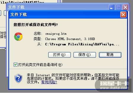 1、开机后弹出两个文件下载的提示对话框,分别是mini.htm和cmaiprog.htm,提示“打开、保存、取消”三个选项。