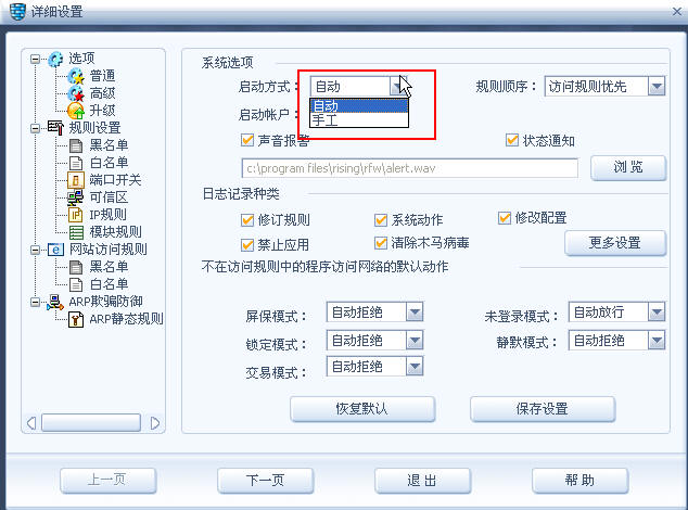 打开瑞星个人防火墙主程序/设置/详细设置/普通选项,在系统选项中设置启动方式,将启动方式设置为“手动”单击“保存设置”进行保存。