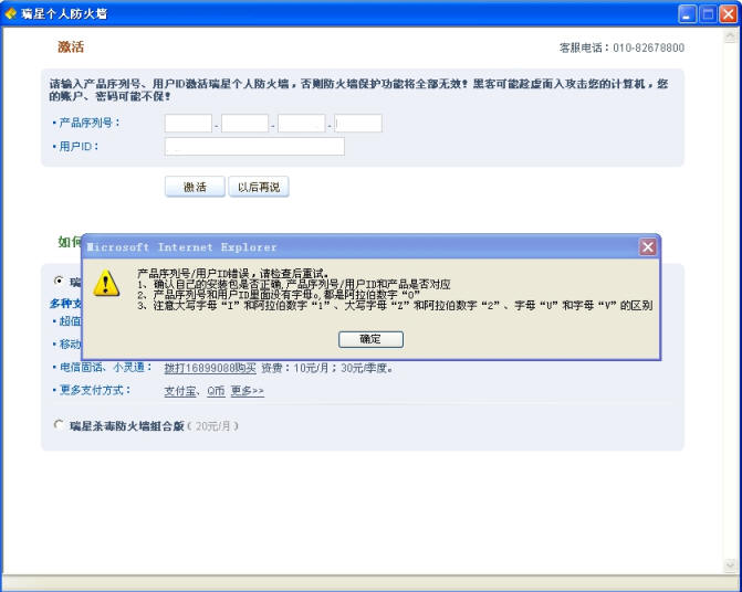 现象描述:从瑞星的网站下载了个人防火墙下载版后安装、输入了正确的序列号和ID号无法激活。