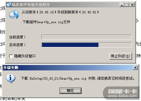 3、原因是升级后提示重新启动(升级前后的版本忘了),重起后提示C:\Documents and Settings\All Users\Application Data\Rising\Rfw\RsConfig.cfg损坏,我到该文件夹下察看是没有RsConfig.cfg文件,于是到瑞星官网下载新版选择添加删除功能安装,安装后版本为20.45.10,升级时提示如下图。