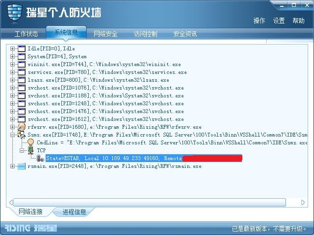 在启用瑞星防火墙后使用SQL Server Management Studio 无法正常连接远程服务器,远程服务器使用端口8433。SQL Server Management Studio使用2005版和2008版均存在此问题。