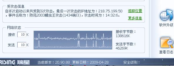 我原来一直用的08版的瑞星个人防火墙,平常按提示升级,但我从来没有发现它能拦截到什么,昨天我把它删除了,重新用08的安装一次,然后手动升级,结果发现了一个很不可思议的事情.升级的时候提示从旧版本升级到新版本(20.90.88),对版本我还是比较熟悉,我记忆的新版本号该是21开头了,可是我升级 完了打开,果真是20.90.88,我以为还要再次升级,于是点智能升级,提示已经是最新了.可是我的版本明明还是20开头的啊,请看我的附件抓图.而且,这个版本倒还好用,时不时就会有提示:禁止****ping入,拦截蠕虫攻击.....,似乎比原先的新的版本还有效.这是怎么回事?