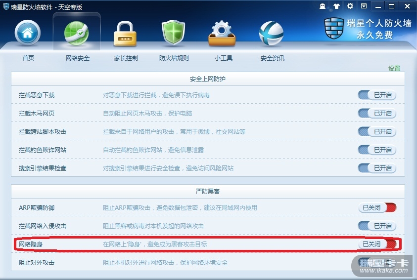 最后测试了一下,瑞星防火墙_主界面中_网络安全_严防黑客_项目中的几个开关!