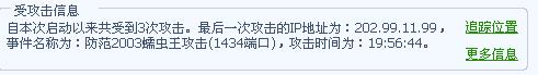 从昨天开始只要运行起浩方对战平台,防火墙就提示系统受到防范2003蠕虫王攻击 1434端口