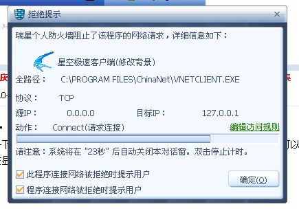 点击确定一下就可以了,如果长时间不点确定,防火墙会自动默认拒绝,这时可以打开防火墙-访问规则-找到图示的程序,应该显示红叉,双击这条信息,放行该规则后即可。