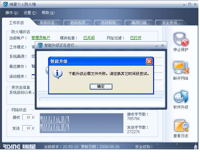 夜里12点,早上6点都不能升啊,不过晚上5点的时候杀毒软件升好了,可放火墙还是不能升。有解决办法没?